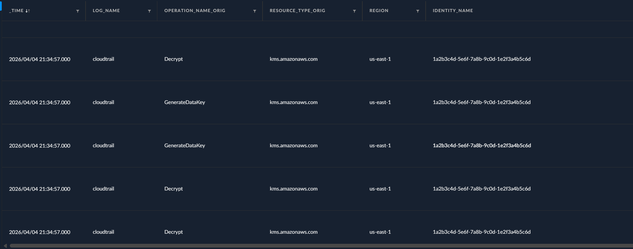 So this does give us a bit of context. Sadly though, since the decrypt events stem from AWS itself, we don’t get any meaningful IOCs (IP address, user-agent). We could probably establish some form of pattern of life for our apps and establish a treshold for how many of these read/write events are expected and we could then set a threshold. Then again, it’s not a GREAT way of detecting these events but it’s definitely better than nothing. One thing worth highlighting is that despite those not making great detection events, they sure as shit can come in handy when doing forensic analysis without data events. Identifying large spike of these events retroactively isn’t too complicated.