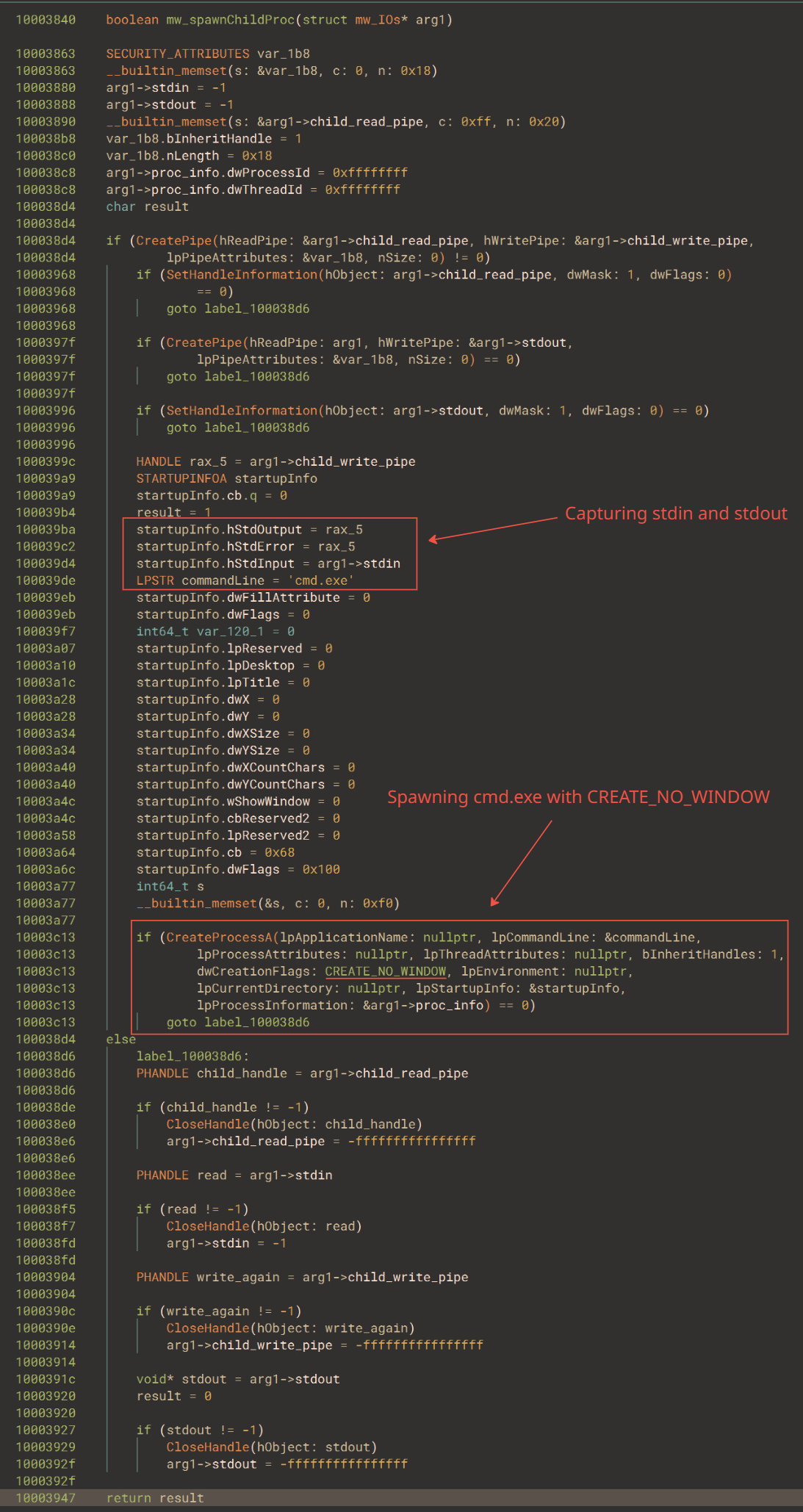 Before running any command, it’ll start creating a new session and creating a child process running cmd.exe while saving it’s stdin and stdout handles to a custom structure (this is important for the next steps). We can also note that the child process is create with the CREATE_NO_WINDOW (0x08000000) dwCreationFlag which makes sure that no window pops up.